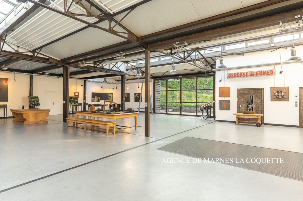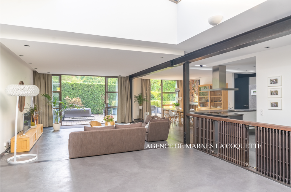 Rueil-Malmaison. Forêt domaniale. Sur un terrain d'environ 1000m², exceptionnelle maison contemporaine de plain-pied de 524 m² habitables avec surface de 123m² à usage mixte en rez de jardin. Triple réception traversante sur terrasses sud, cuisine US équipée et office. 4 suites avec leur, salle de bain et wc séparé dont une master. Nombreuses possibilités (chambres supplémentaires, espaces de réception, salle de sport, piscine intérieure etc...). A l'Ouest : Bel espace de 130m² aménagé à usage mixte en rez de jardin avec terrasse et piscine exterieure. Garages avec rampe d'accés et ascenceur. Parking 12 places. Havre de paix, proche écoles Passy-buzenval et Danielou.
