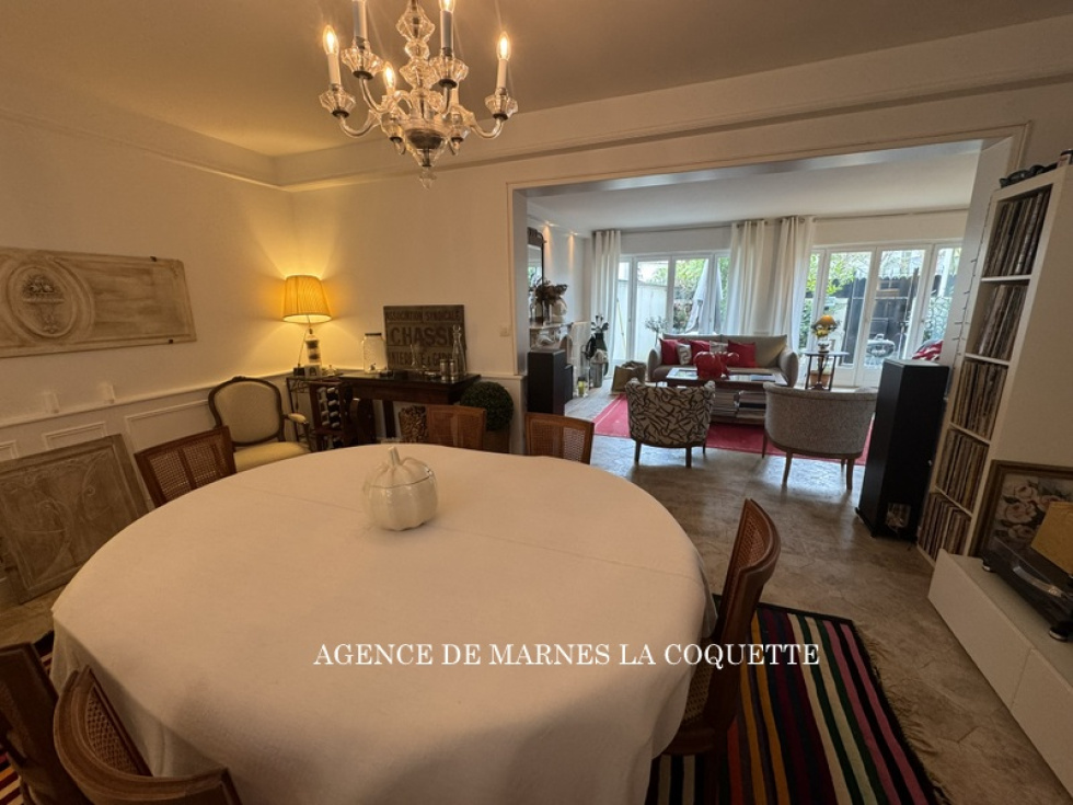 Marnes la Coquette. Au coeur du village, à l'entrée du parc de Saint-Cloud, maison de ville en duplex offrant une belle entrée, salon cheminée de plain-pied sur terrasse sud, cusine équipée, salle à manger et lingerie. A l'étage 4 chambres, 1 salle de douche, une salle de bain, dressing, bureau sur balcon. Etat impeccable. Possibilité profession libérale.